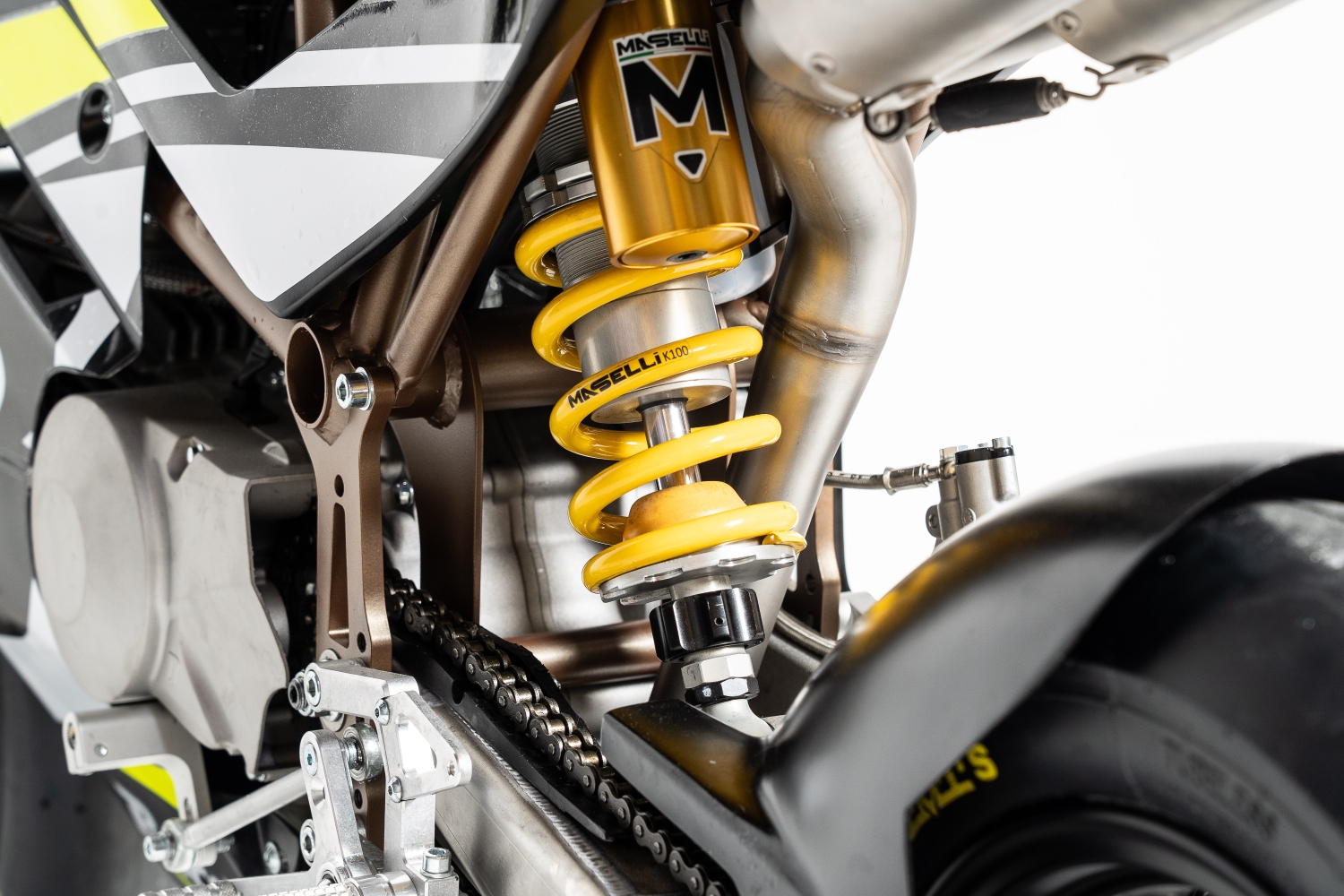 Die Bikes kommen komplett montiert und eingestellt mit Maselli Gabel (Zug, Druckstufe), Maselli Federbein (komplett verstellbar), speziellen MIVV Auspuff, alle Slider, Flüssigkeitsbehälter, Doppelscheibenbremse vorne mit 2 Kolben Bremssattel von Formula, Gasgriff Domino, Aerodynamik Verkleidung, PMT Slick Reifen.
